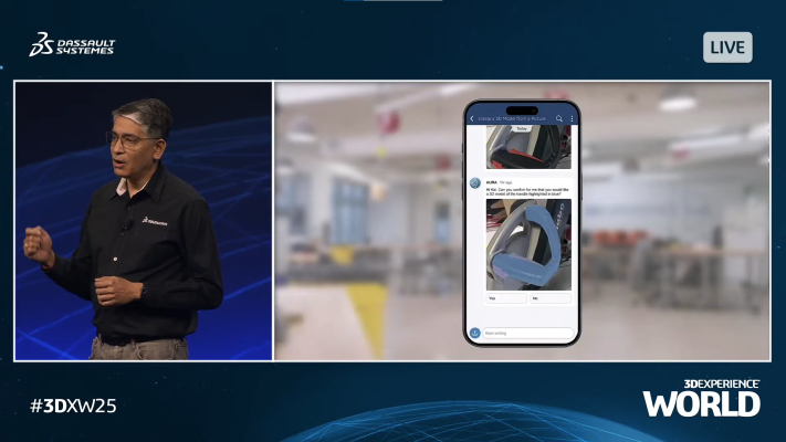 Manish Kumar, CEO SOLIDWORKS, przedstawił zastosowanie AI w procesie projektowania, w tym generatywne szkicowanie i automatyczne tworzenie rysunków z modeli 3D. Zaprezentował również AURA, wirtualnego asystenta wspomaganego przez AI, który analizuje obrazy i przekształca je w precyzyjne modele 3D, gotowe do symulacji.