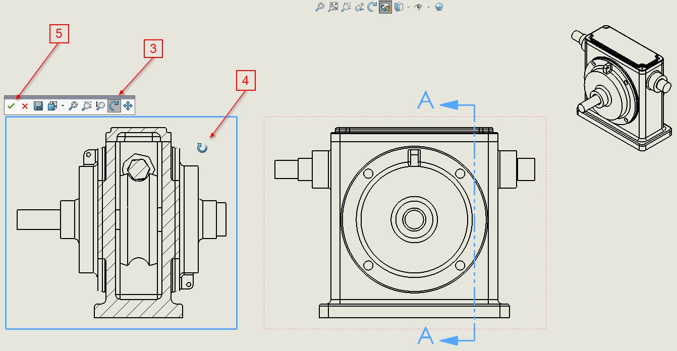 Funkcja Widok rysunku w 3D pozwala na swobodne obracanie widoków znajdujących się na arkuszu. Można dzięki niej stworzyć na przykład przekrój w rzucie izometrycznym, co pozwala na pokazania w dowolny sposób wnętrza skomplikowanego komponentu lub złożenia. Wystarczy wybrać opcję Widok rysunku 3D (1) z paska widoku, a następnie wskazać widok, który chcemy obrócić (2).