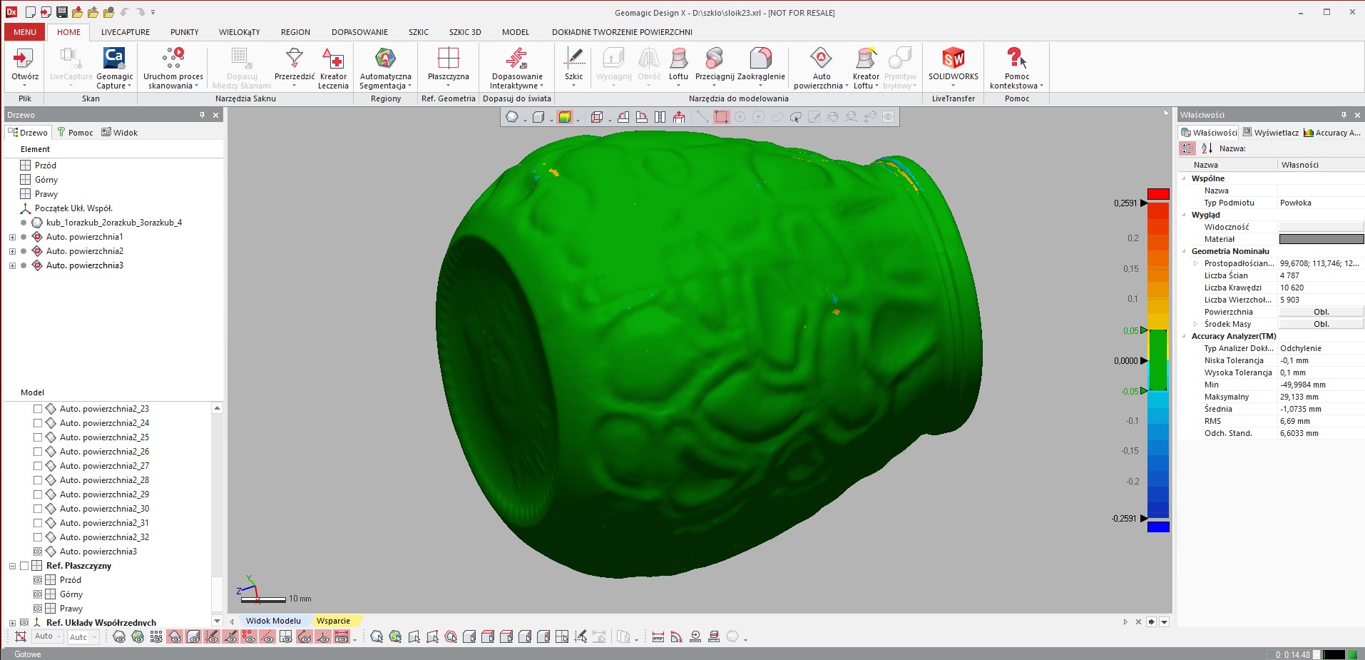 Analiza odchylenia powierzchni od siatki: na zielono pokazany zakres od +0,05mm do -0,05mm.